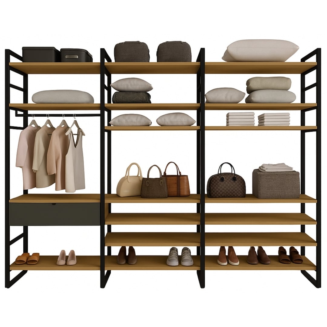 - En Dormitorios: Usa el estante como un espacio abierto para organizar tus prendas de uso diario, bolsos, y zapatos. Compleméntalo con perchas metálicas para un look cohesivo y moderno.